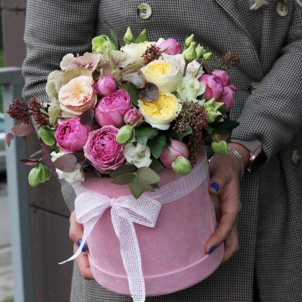 Букет из гортензии, роз, лилии, гербер, лимониума, сантини и эустомы в стильной упаковке Туманное поле