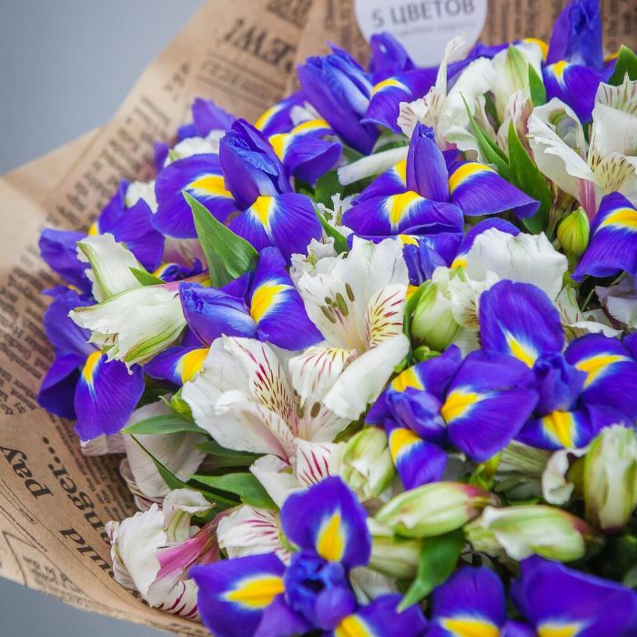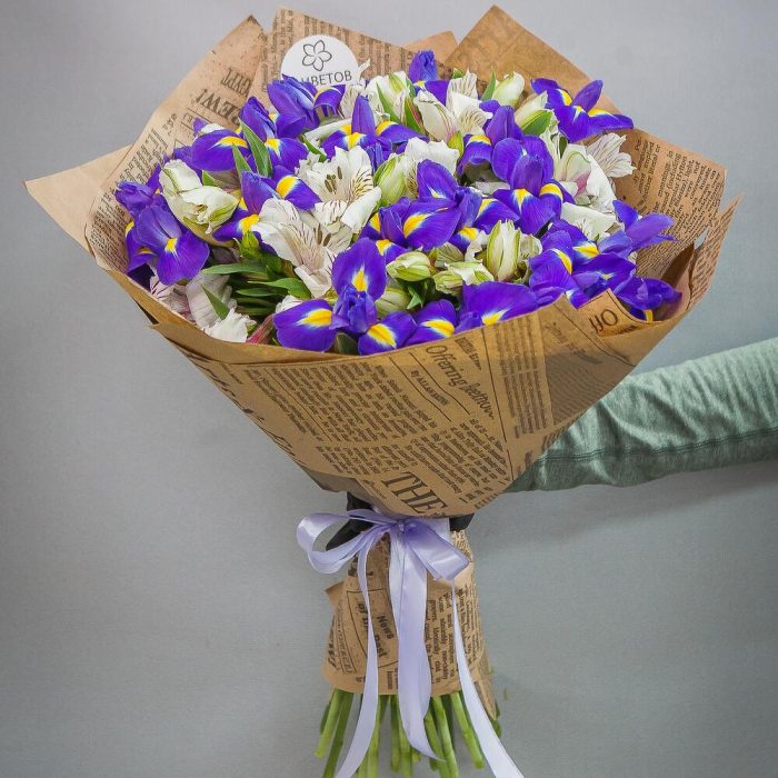 Альстромерия белая – 15 шт.ирисы – 20 шт.Упаковка крафт – 1 шт.Лента атласная – 1 шт.