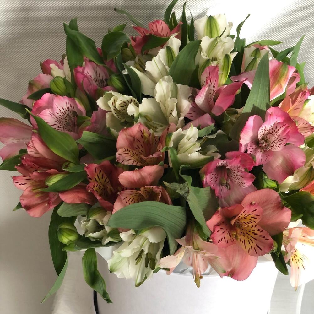 Композиция в коробке из стойких и красивых альстромерий
