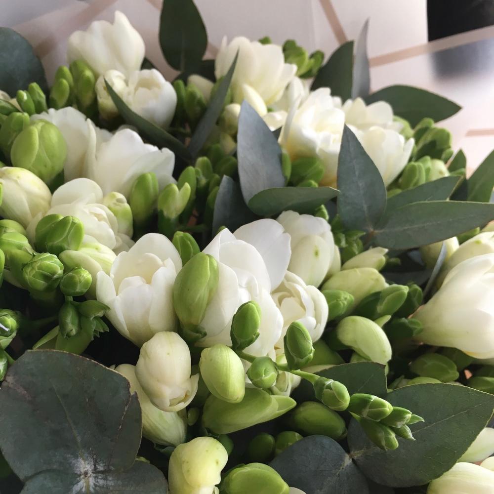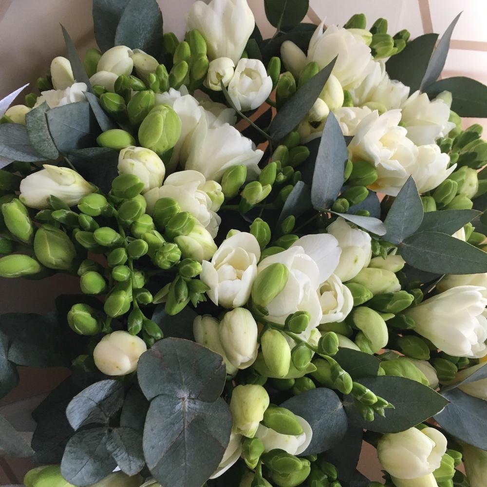 Фрезия белая – 49 шт.Эвкалипт – 20 шт.Упаковка дизайнерская – 5 шт.Лента атласная – 4 шт.