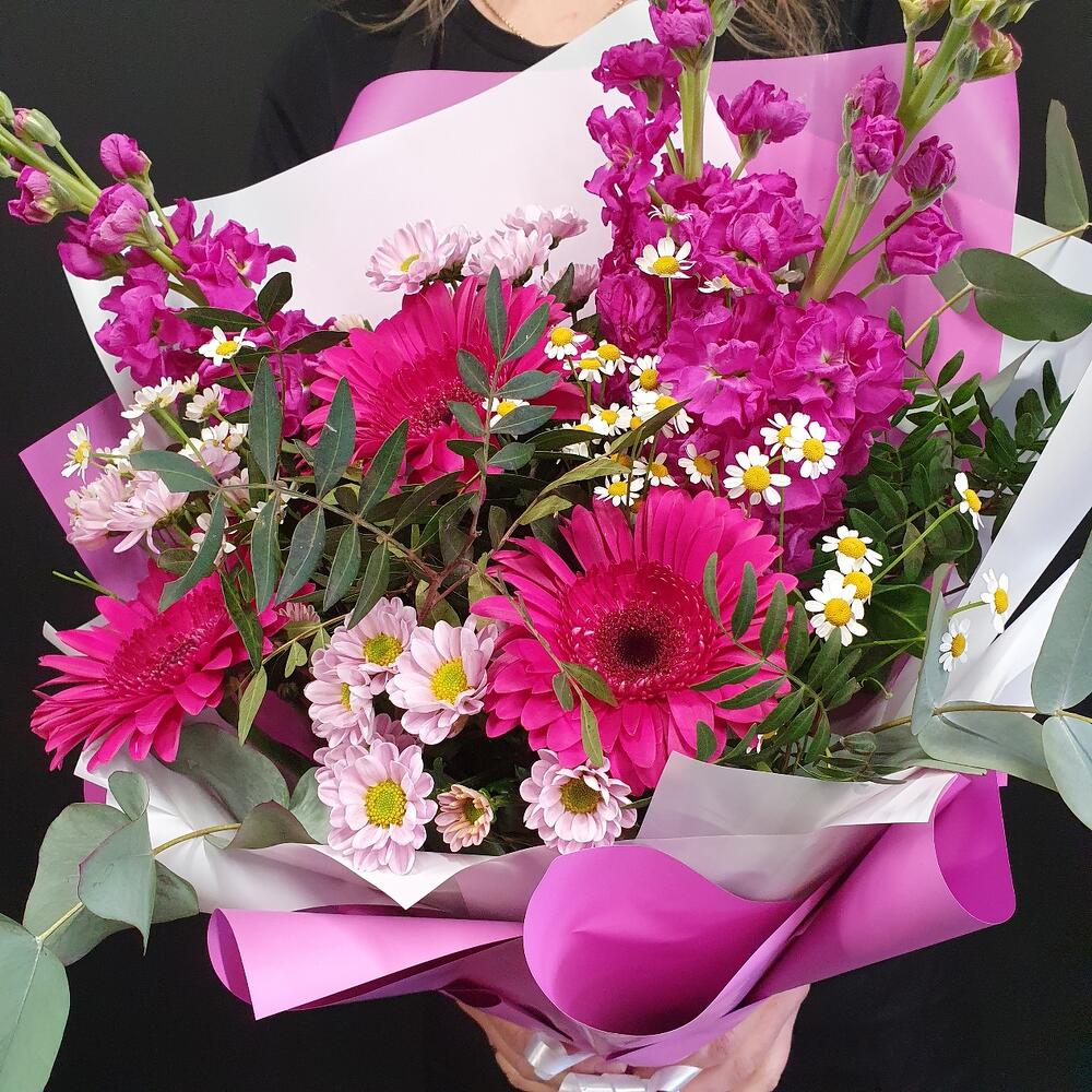 Маттиола – 3 шт.Матрикария – 2 шт.Сантини – 3 шт.Гербера – 3 шт.Фисташка – 3 шт.Эвкалипт – 3 шт.Упаковка дизайнерская – 1 шт.
