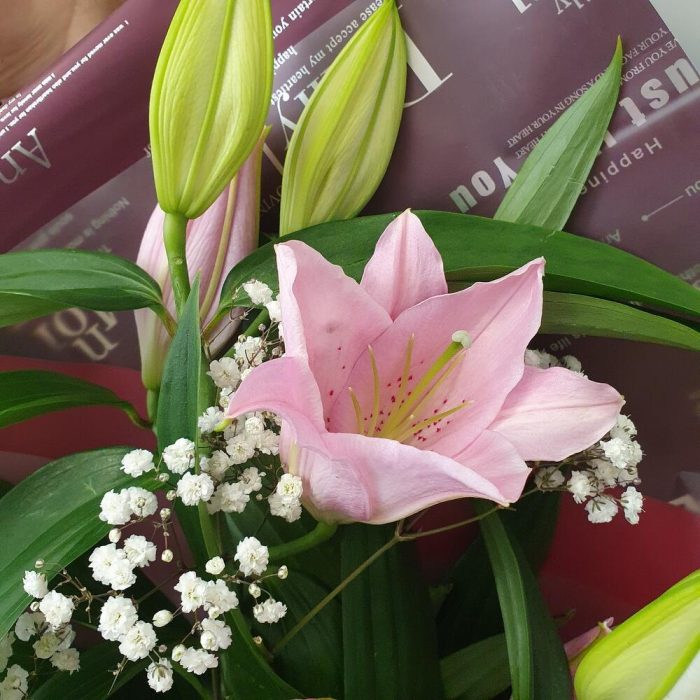 Лилия – 3 шт.Гипсофила – 1 шт.Упаковка дизайнерская – 1 шт.