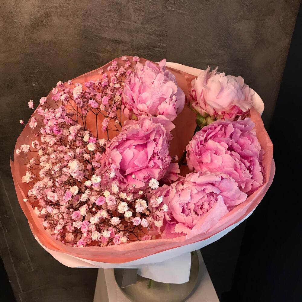 Гипсофила – 2 шт.Лента – 1 шт.Тишью – 2 шт.Пион Сара Бернар – 5 шт.Пленка матовая – 1 шт.Средство для продления жизни цветов – 1 шт.