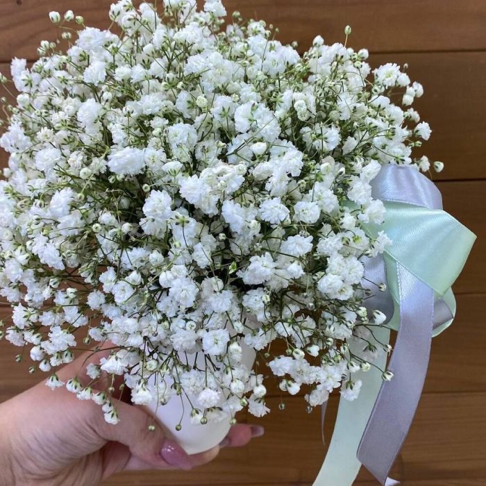 Гипсофила – 5 шт.Оазис флористический – 1 шт.Стакан – 1 шт.бант атласный – 2 шт.