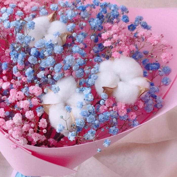 Хлопок – 3 шт.Лента атласная – 1 шт.Упаковка дизайнерская – 1 шт.гипсофила радужная – 3 шт.