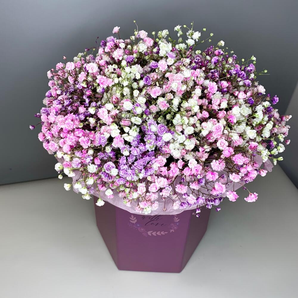 гипсофила радужная – 9 шт.Коробка шляпная – 1 шт.Тишью – 2 шт.Оазис флористический – 1 шт.Пленка прозрачная – 1 шт.Лента атласная – 2 шт.