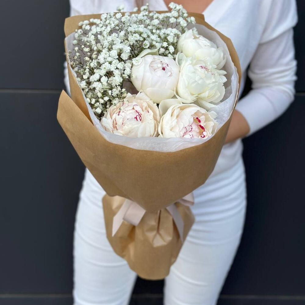 Гипсофила – 2 шт.Подарочная упаковка – 1 шт.Средство для продления жизни цветов – 1 шт.пионы белые италия – 5 шт.