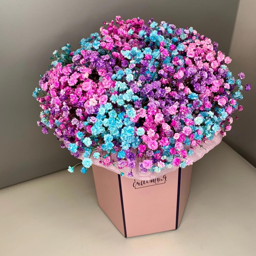 гипсофила радужная – 8 шт.Коробка шляпная – 1 шт.Тишью – 2 шт.Оазис флористический – 1 шт.Пленка прозрачная – 1 шт.Лента атласная – 2 шт.