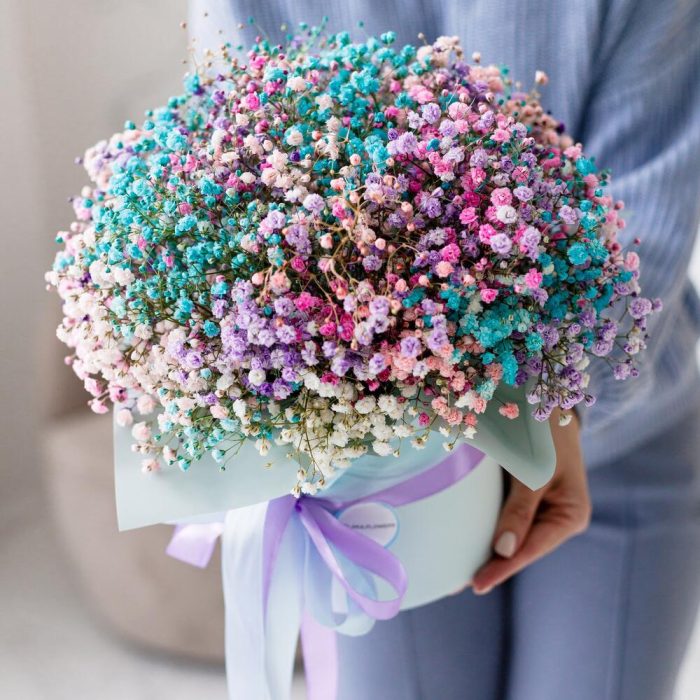 Лента атласная – 2 шт.Коробка шляпная – 1 шт.Оазис флористический – 2 шт.гипсофила радужная – 9 шт.