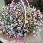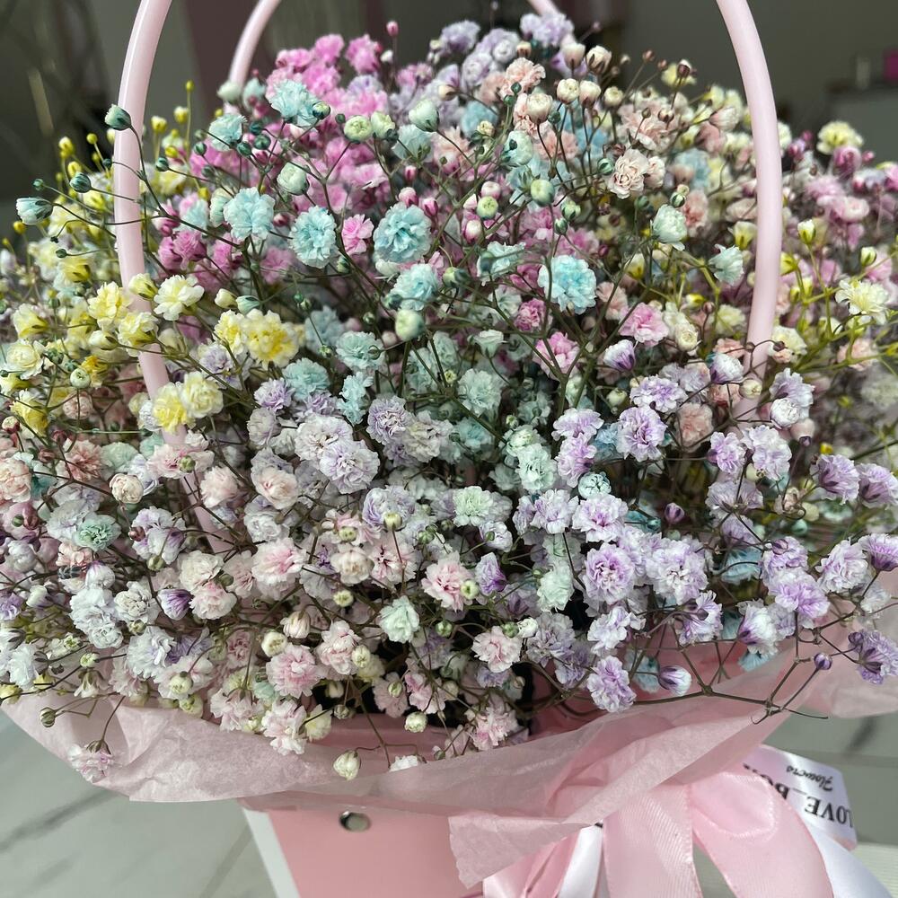 Радужная гипсофила в сумочке, цветы уже в губке с водой, очень долгостойкие, позже становятся сухоцветом и могут стоять вечно