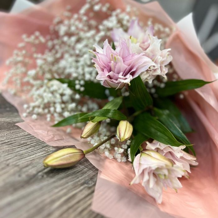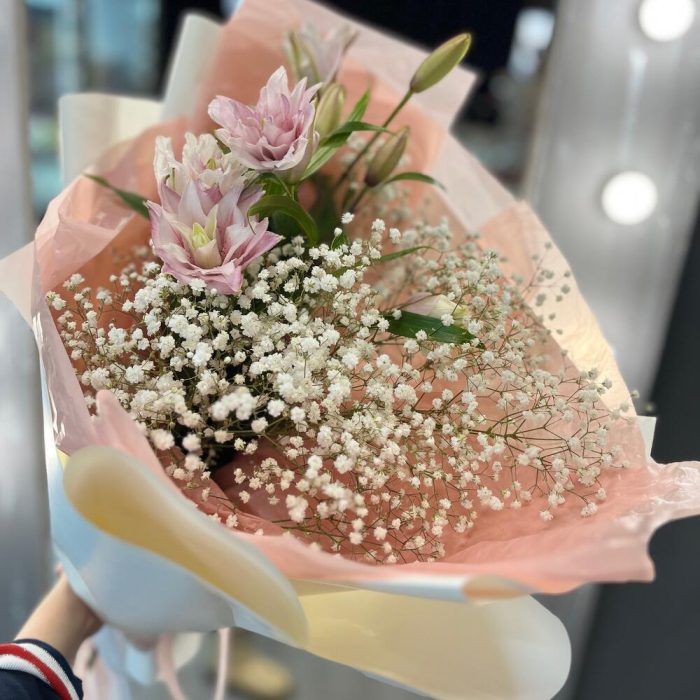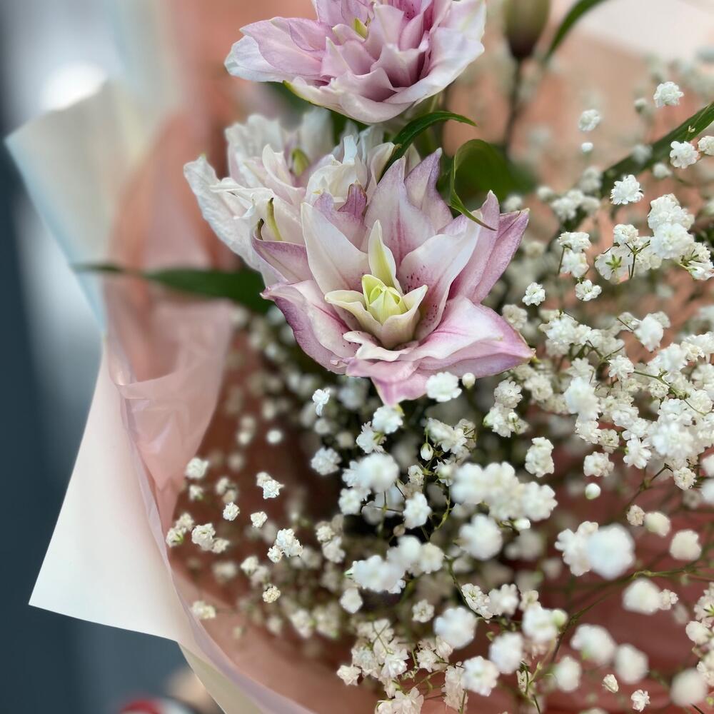 Гипсофила – 5 шт.Лента – 2 шт.Лилия – 1 шт.Упаковка дизайнерская – 3 шт.