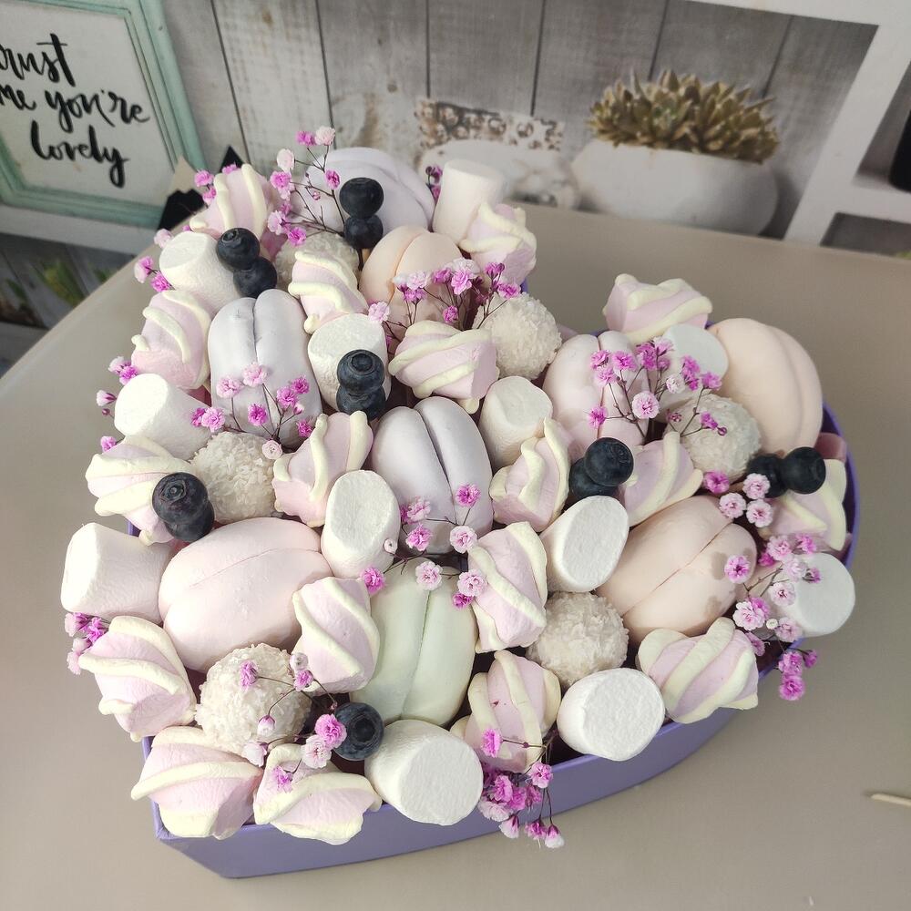 “Сладкое сердце ” – цветочная композиция с сладостями в коробке “Сердце”
