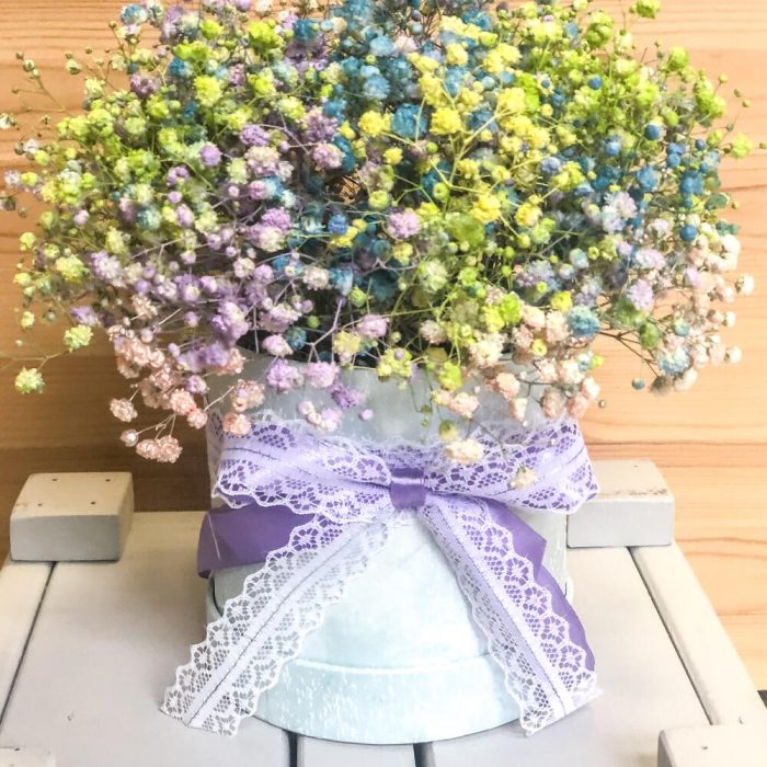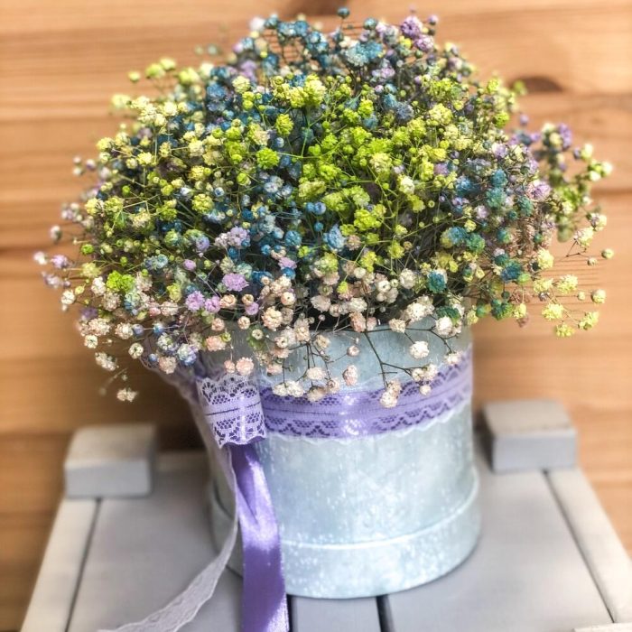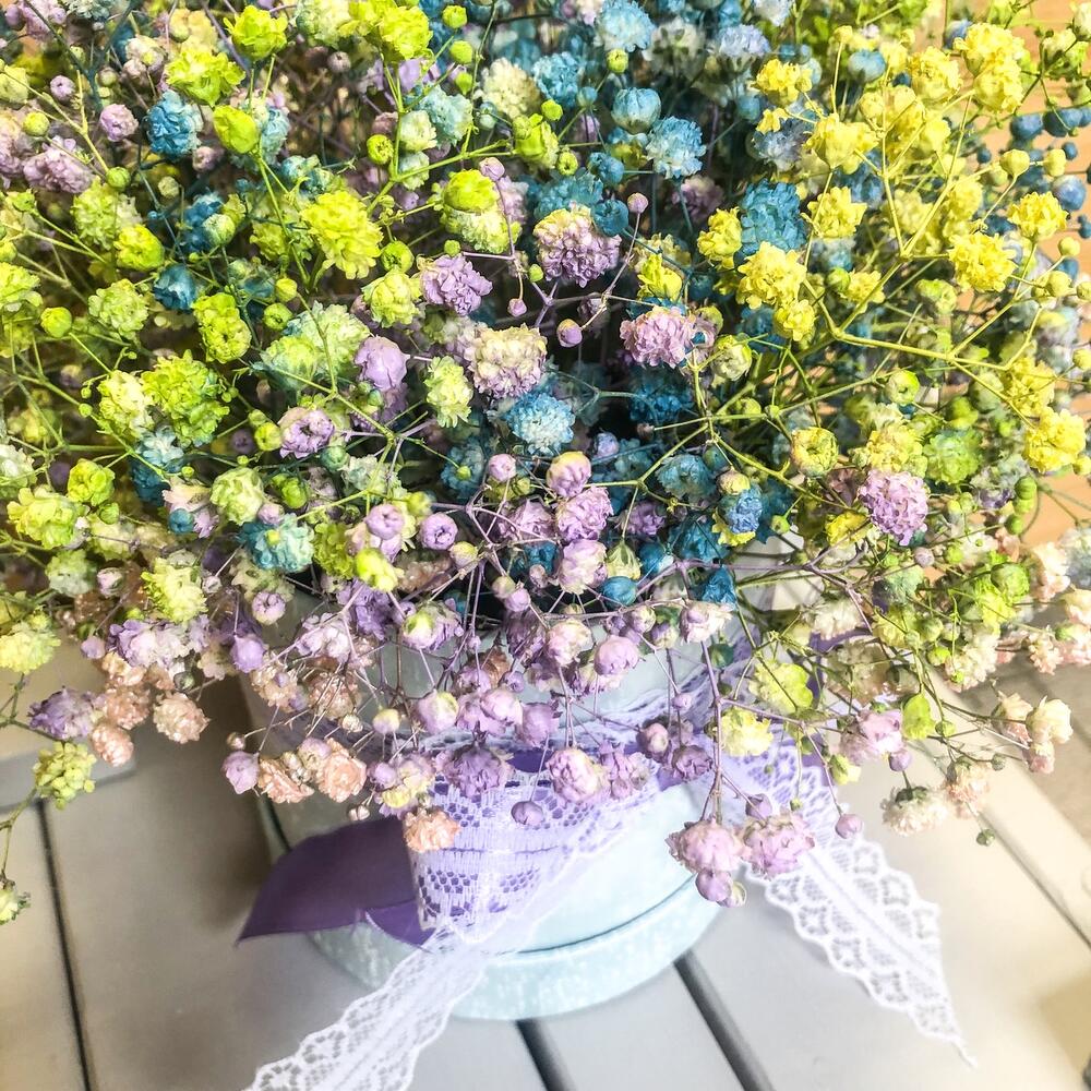 Гипсофила – 7 шт.Шляпная коробка – 1 шт.Оазис – 1 шт.Лента атласная – 2 шт.Пленка матовая – 1 шт.