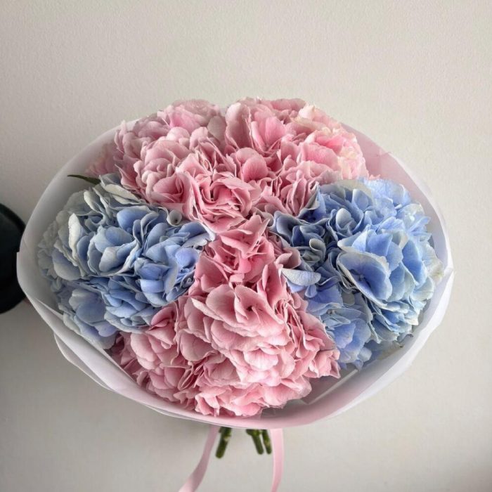 Гортензия розовая – 3 шт.Гортензия голубая – 2 шт.Упаковка дизайнерская – 1 шт.Лента атласная – 2 шт.Открыточка с вашими пожеланиями – 1 шт.хорошее настроение – 100 шт.инструкция по уходу за цветами – 1 шт.коробка переноска – 1 шт.Кризал – 1 шт.