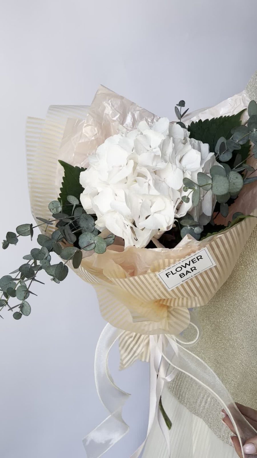 Гортензия – 1 шт.Эвкалипт – 2 шт.Лента атласная – 1 шт.Упаковка дизайнерская – 1 шт.
