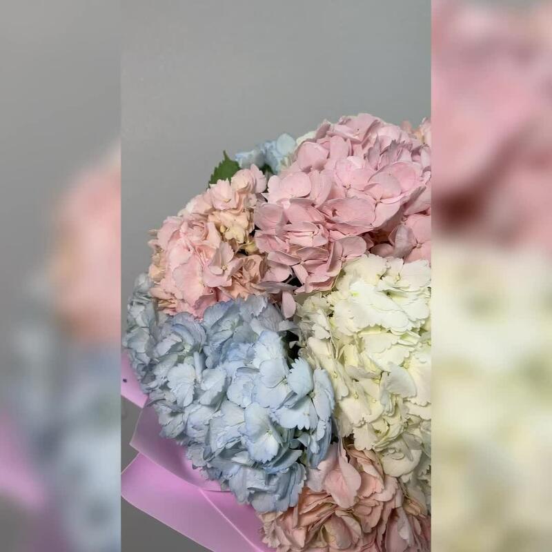 Авторская композиция из гортензий, роз и ранункулюсов в шляпной коробке