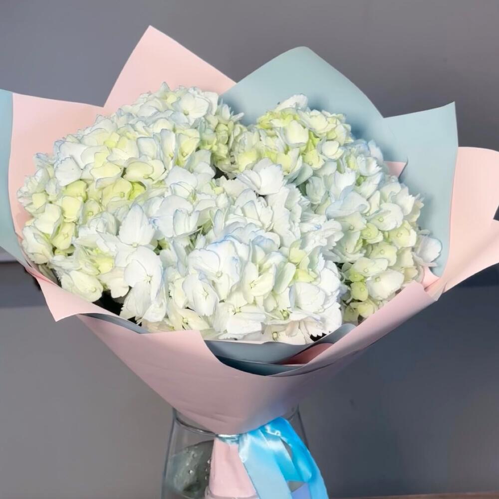 Гортензия голубая – 3 шт.Упаковка дизайнерская – 1 шт.Лента атласная – 1 шт.