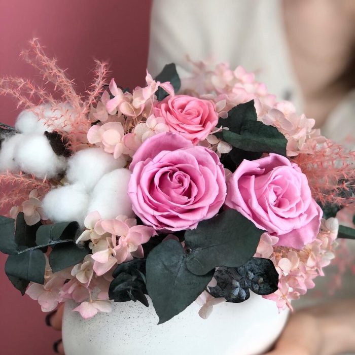 Хлопок – 3 шт.Керамическая ваза – 1 шт.гортензия стабилизированная – 15 шт.стабилизированные цветы микс – 5 шт.