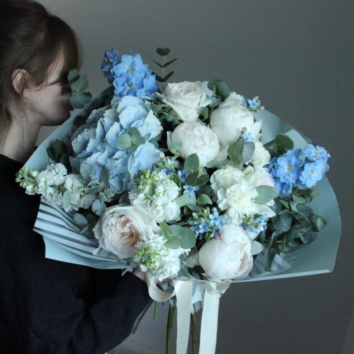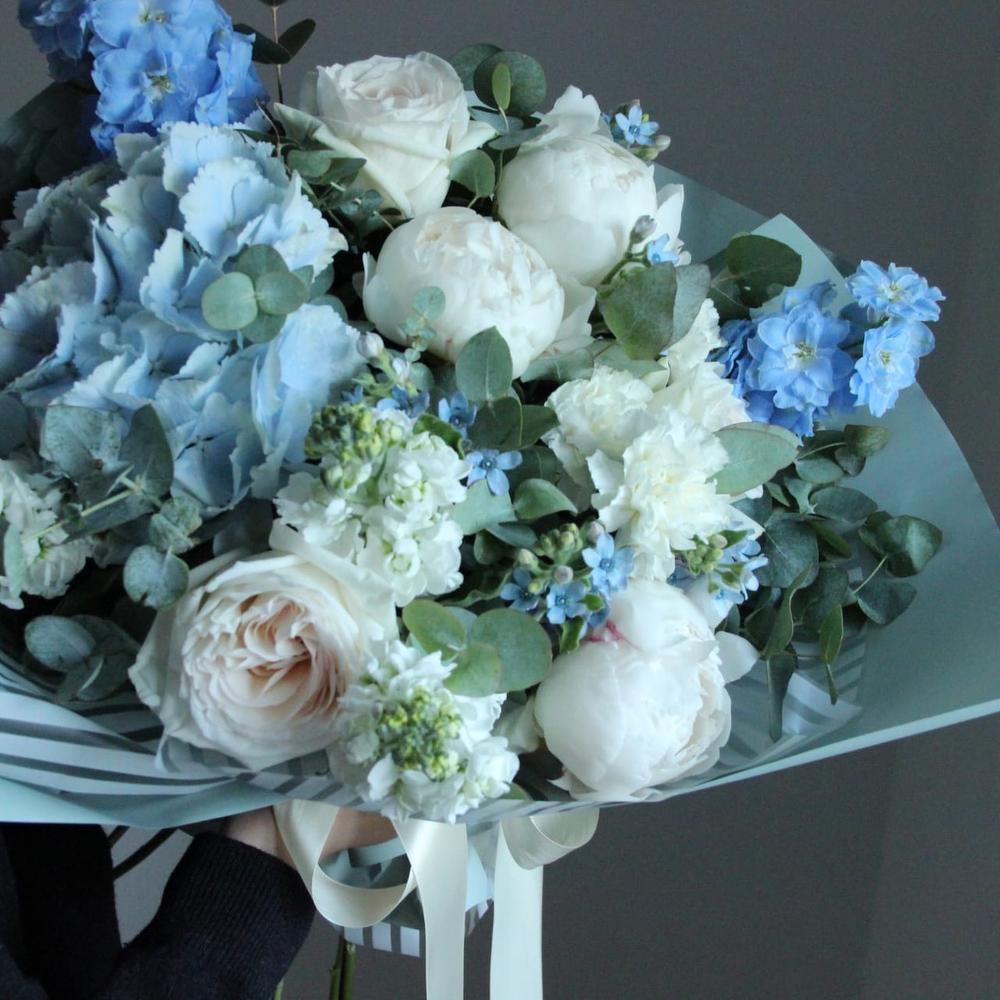 Дельфиниум – 2 шт.Твидия – 5 шт.Ранункулюс – 3 шт.Пион – 3 шт.Маттиола – 3 шт.Гвоздика – 5 шт.Упаковка дизайнерская – 2 шт.Лента атласная – 1 шт.