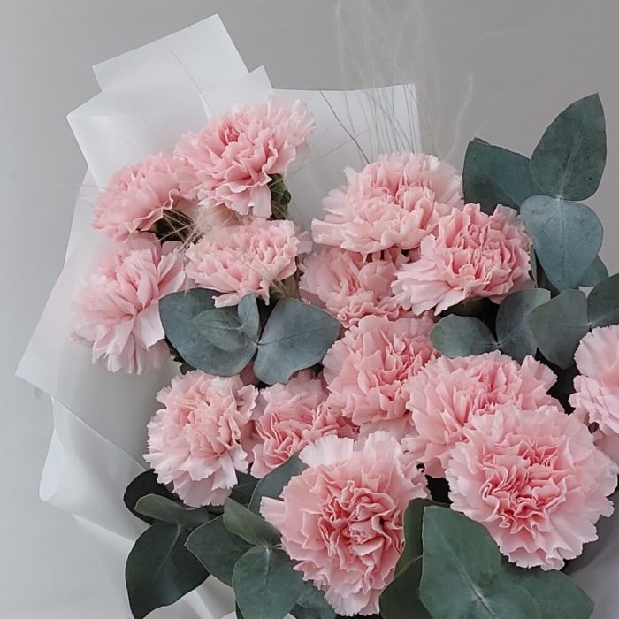 Диантус – 15 шт.Эвкалипт – 2 шт.Ковыль – 1 шт.Упаковка дизайнерская – 3 шт.Лента атласная – 1 шт.