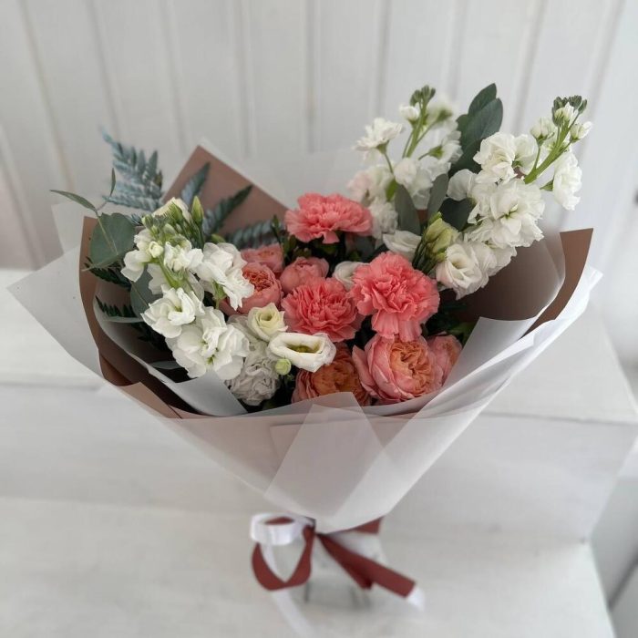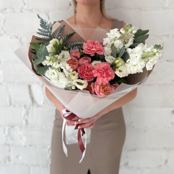 Маттиола – 3 шт.Папоротник – 1 шт.Эвкалипт – 2 шт.Диантус – 3 шт.Фисташка – 5 шт.Упаковка дизайнерская – 3 шт.эустома белая – 2 шт.пионовидные кустовые розы – 2 шт.
