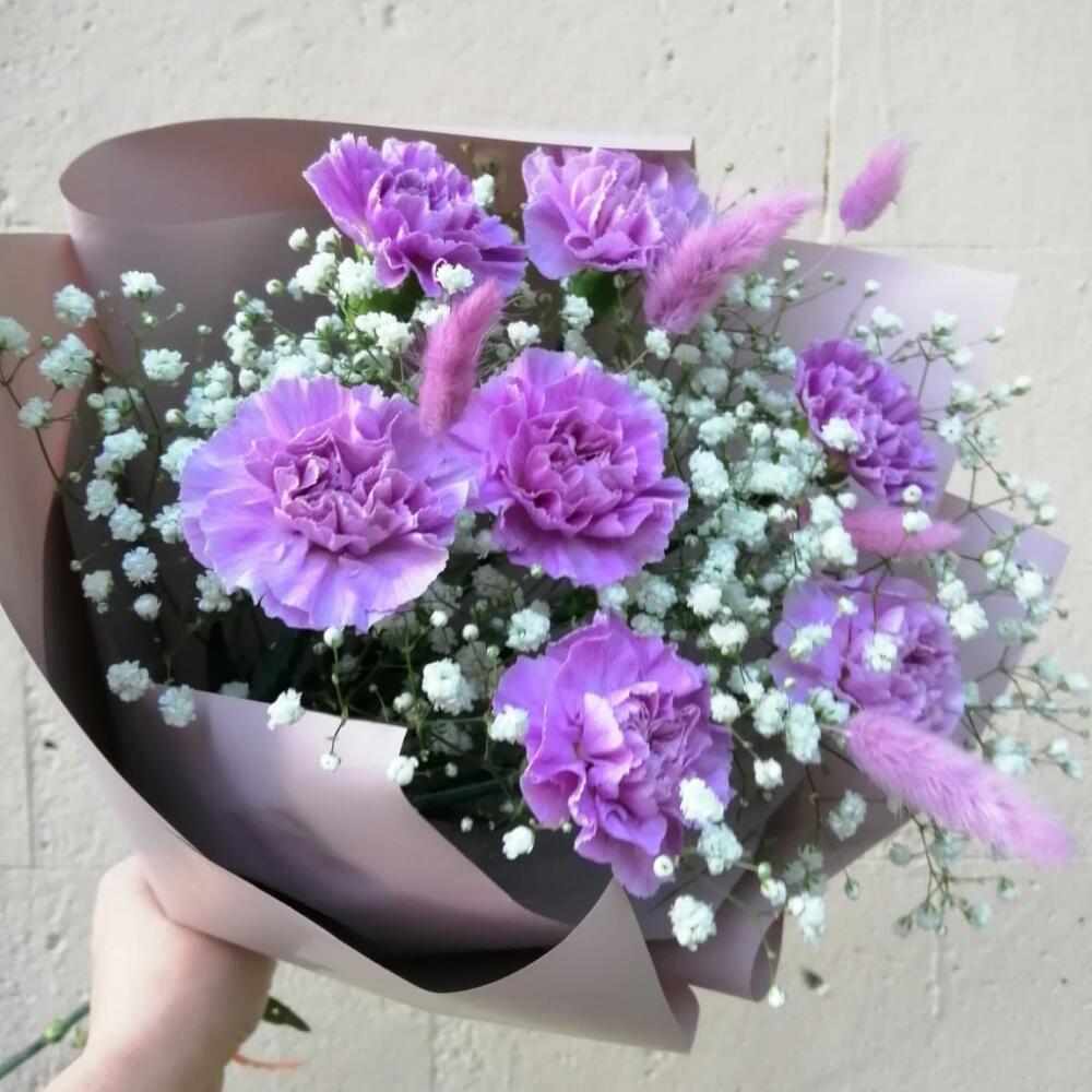 Гвоздика лунная – 7 шт.Гипсофила – 2 шт.Лагурус – 5 шт.Упаковка – 1 шт.Лента – 1 шт.