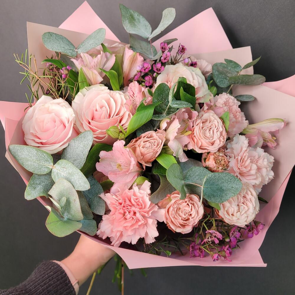 Букет роз, альстромерии и эвкалипта «Розовый закат»