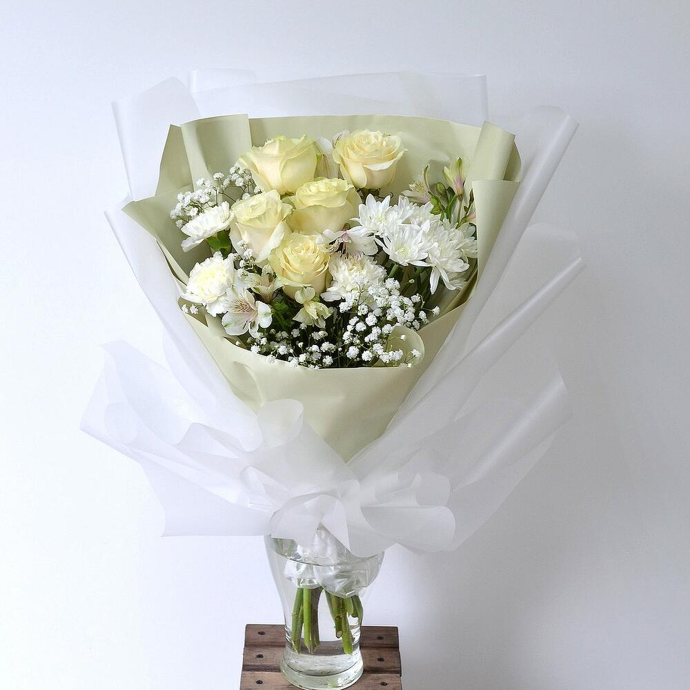 белые розы (эквадор) – 5 шт.Гипсофила – 3 шт.диантусы – 3 шт.Альстромерия – 5 шт.Хризантема – 1 шт.декоративная упаковка и лента – 1 шт.