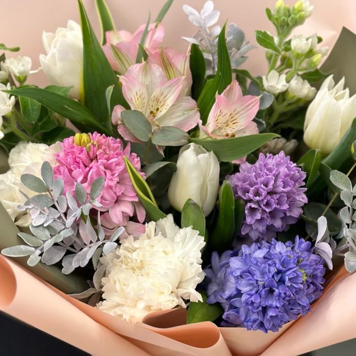 Гиацинт – 3 шт.Тюльпан – 3 шт.Диантус – 2 шт.Альстромерия – 1 шт.Оксипеталум – 2 шт.Фисташка – 3 шт.Дизайнерская упаковка – 2 шт.Лента атласная – 1 шт.