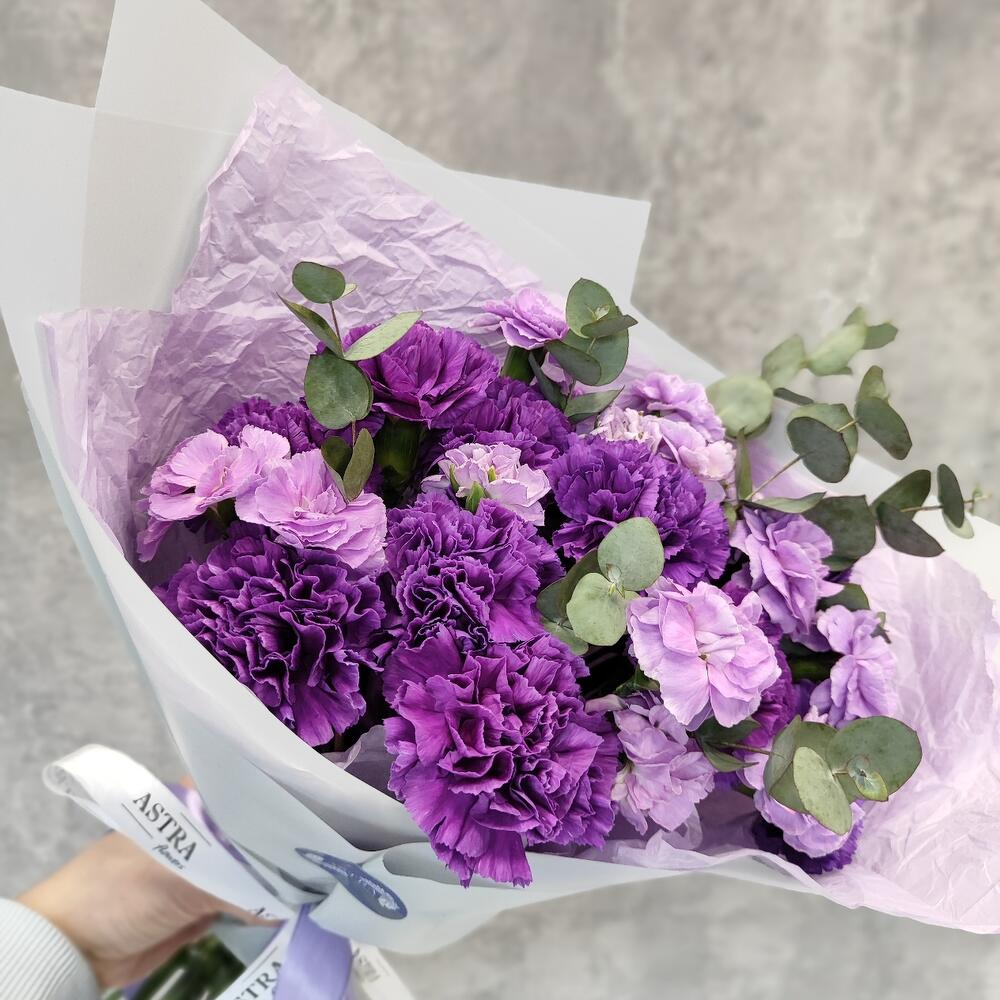 Гвоздика – 13 шт.Гвоздика кустовая – 5 шт.Эвкалипт – 1 шт.Авторская упаковка – 1 шт.Атласная лента – 1 шт.
