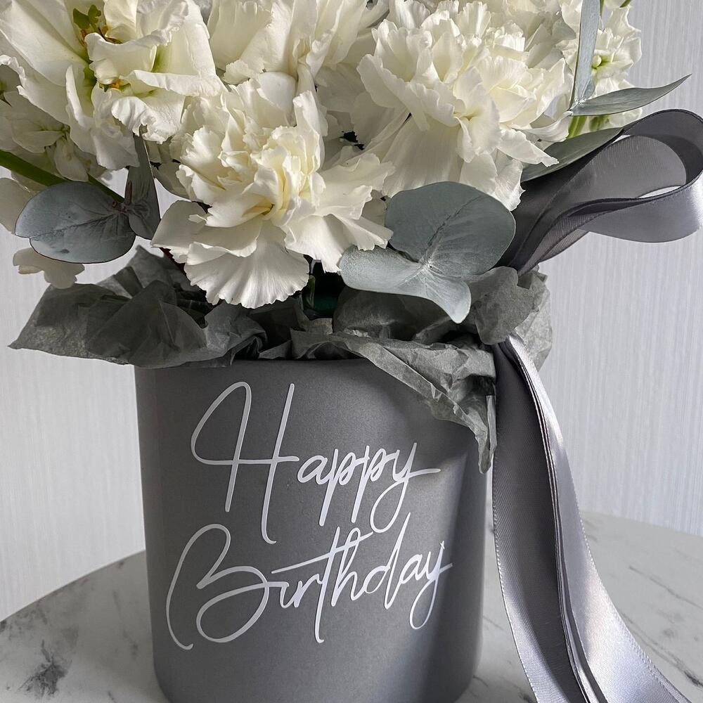 Композиция для тех кто ценит стиль и минимализм Диантусы и маттиола в шляпной коробке с надписью “Happy birthday” и пышными лентами К заказу мы добавляем инструкцию по уходу за цветами, чтобы они вас дольше радовали.Вы можете дополнить заказ воздушными шарами или … Показать ещёкоробкой сюрпризом , ознакомтесь со всем ассортиментом нашего магазина