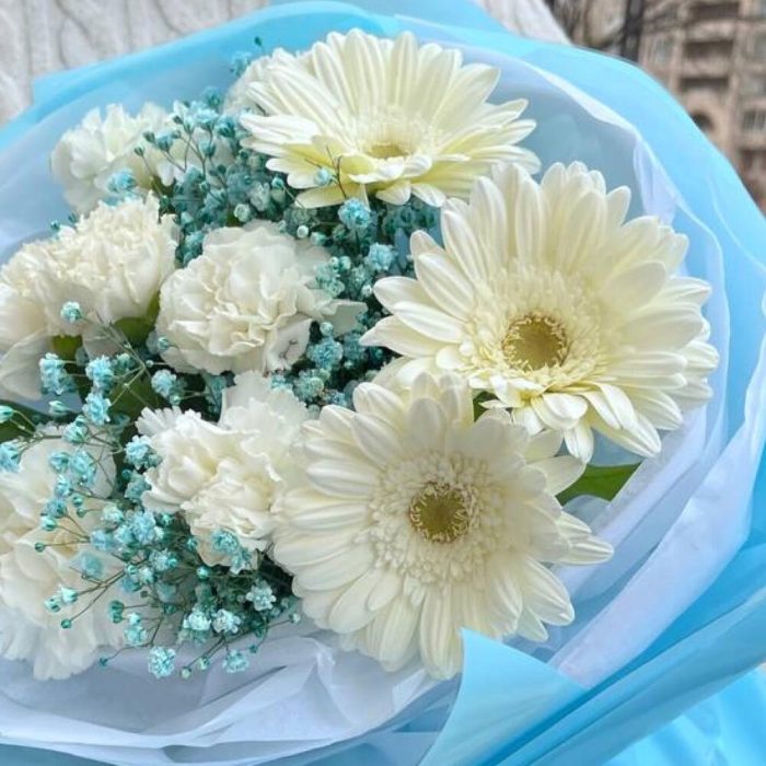 Гербера белая – 3 шт.Гвоздика белая – 5 шт.Салал листья – 5 шт.Гипсофила – 2 шт.Пленка матовая – 4 шт.Тишью – 4 шт.