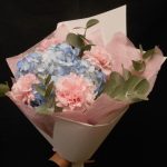 Лента атласная – 3 шт.Гортензия голубая – 1 шт.бумага тишью розовая – 3 шт.пленка матовая белая – 4 шт.гвоздики одноголовые розовые – 6 шт.ветви эвкалипта сухоцвет – 5 шт.