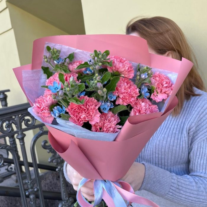 РОЗОВЫЕ ОБЛАКА – это букет, который подарит вам и вашим близким ощущение нежности и романтики. Диантусы и твидия – это цветы, которые имеют розовый и голубой и напоминают о сладких и мечтательных облаках. Этот букет – прекрасный подарок для тех, кто любит мягкие и изящные цветы.Чтобы букет радовал вас дольше, мы подарим вам специальное средство, которое надо будет добавить в вазу с холодной водой. Не забудьте подрезать цветы каждые 2 дня и менять воду – это тоже продлевает жизнь букету!