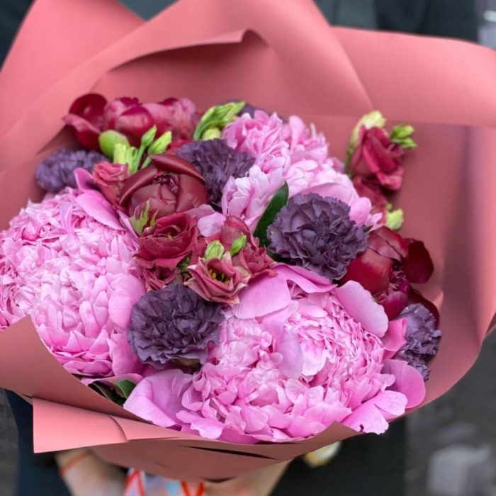 ЯГОДНОЕ МОРОЖЕНОЕ премиум букет с белой эустомой и пионовидными розами