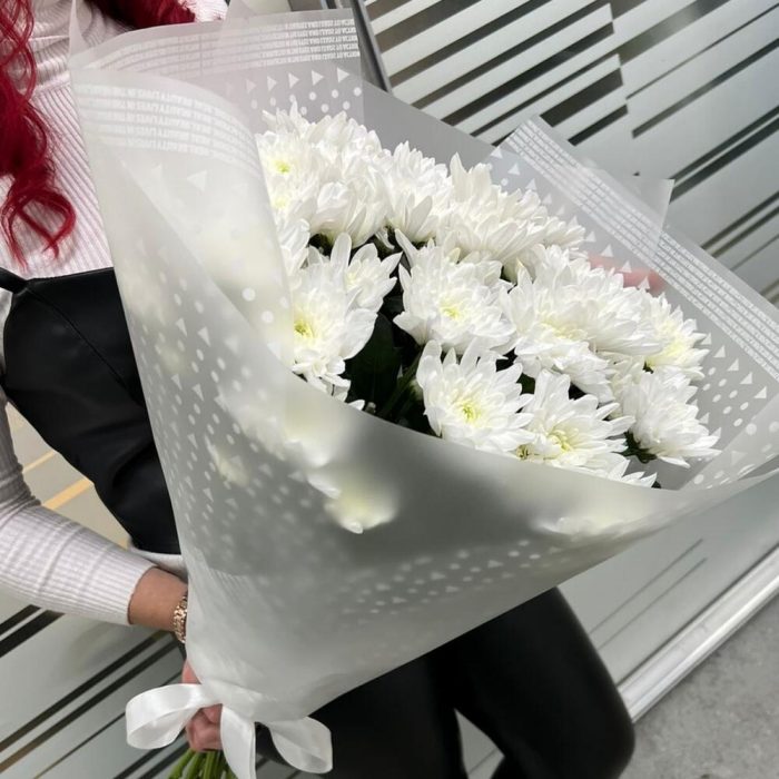 Упаковка – 2 шт.Лента атласная – 1 шт.Хризантема кустовая белая – 9 шт.