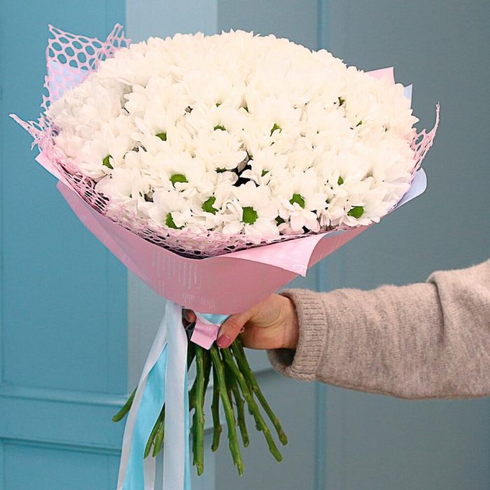 Букет из 25 белых кустовых хризантем Бакарди в дизайнерской упаковке