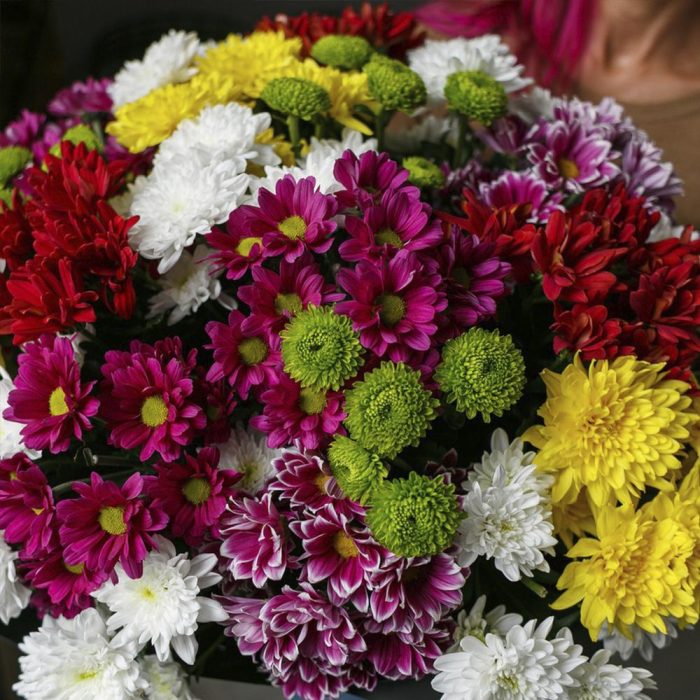 Лента – 1 шт.Упаковка дизайнерская – 1 шт.Хризантема кустовая микс – 25 шт.