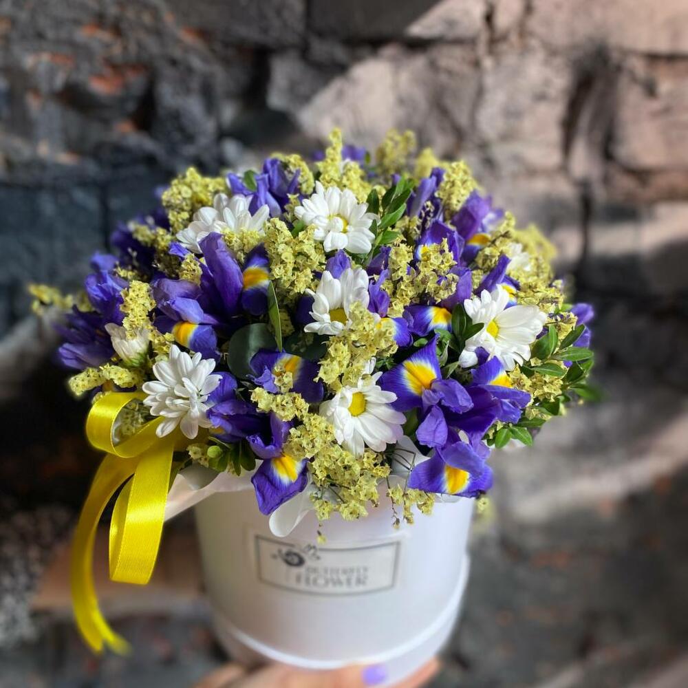 Букет из ирисов, лимониума, кустовых хризантем и самшита в шляпной коробке “Канберра”