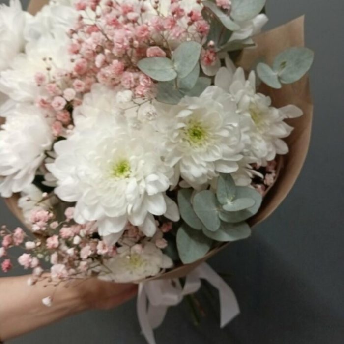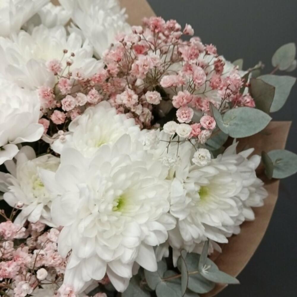 Гипсофила – 2 шт.Хризантема кустовая – 3 шт.Упаковка дизайнерская – 1 шт.зелень декоративная – 1 шт.