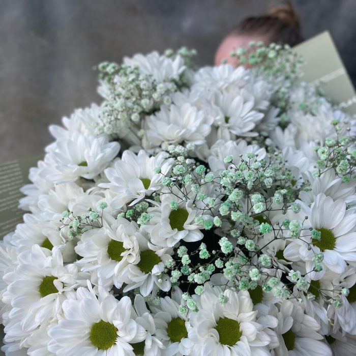 Гипсофила – 5 шт.Хризантема кустовая – 15 шт.Упаковка – 3 шт.