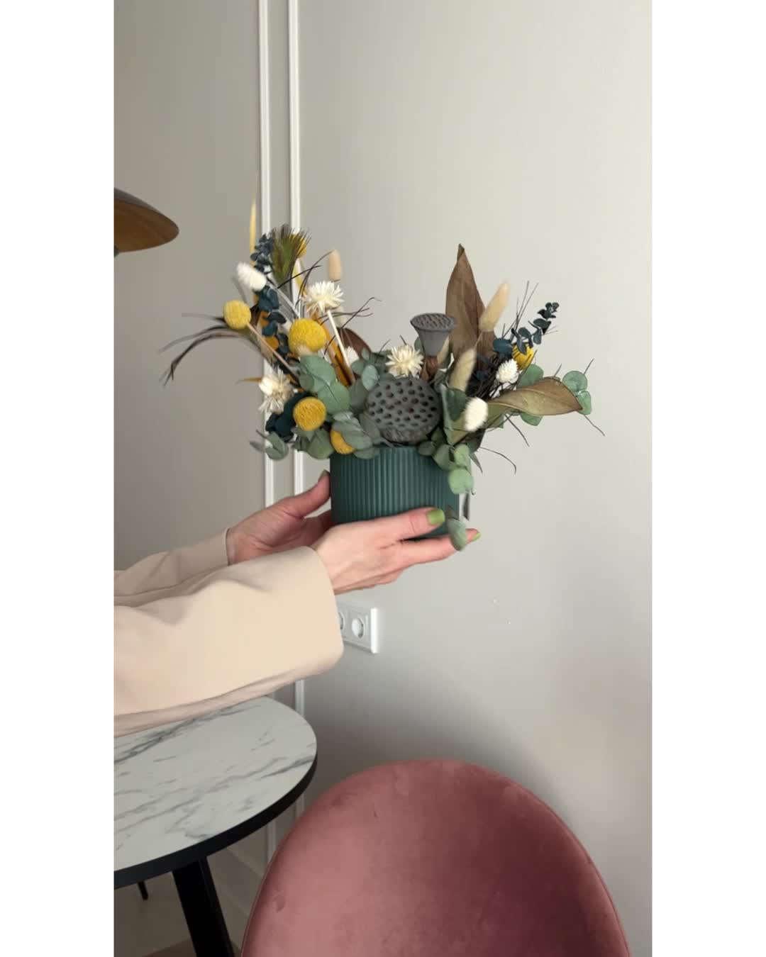 Композиция из сухоцветов и стабилизированных цветов жёлто – изумрудная