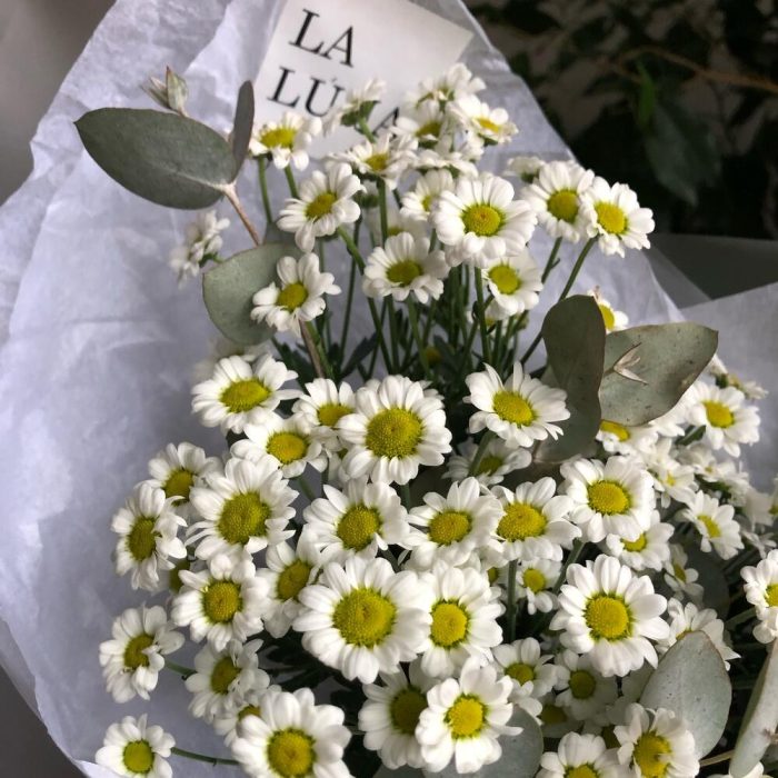 Хризантема Сантини – 7 шт.Лента атласная – 1 шт.Упаковка дизайнерская – 2 шт.Кризал (подкормка) – 1 шт.Аквапак – 1 шт.инструкция по уходу за цветами – 1 шт.транспортировочная упаковка – 1 шт.эвкалипт cineria пучок – 1 шт.