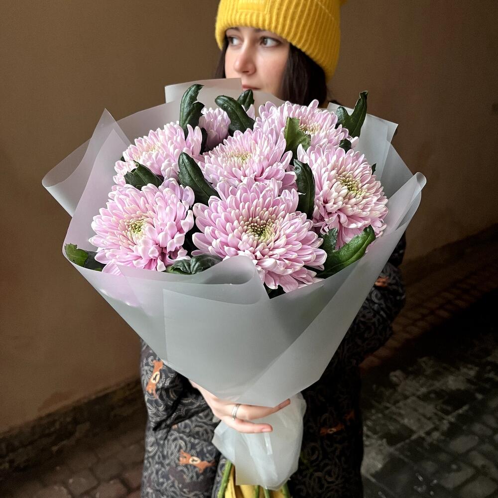 В сиреневую даль: стойкие хризантемы в стильной упаковке