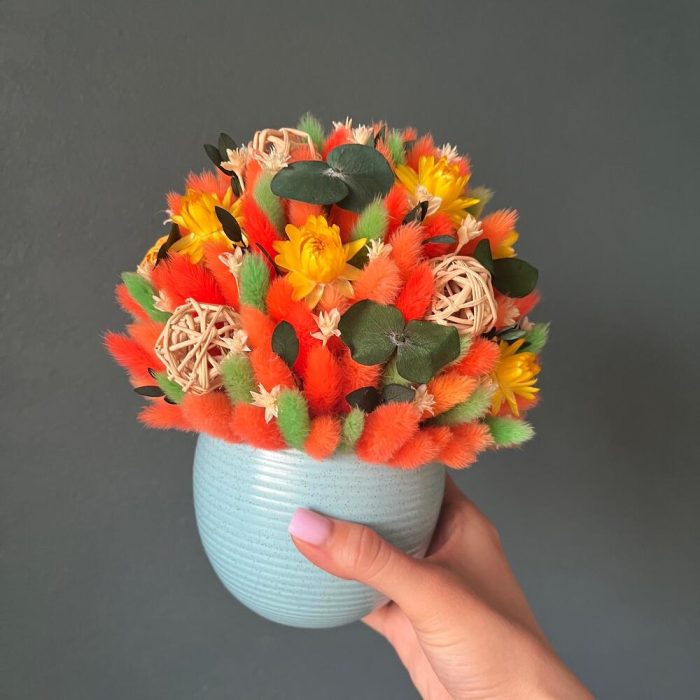 Эвкалипт – 1 шт.Ротанговые шарики – 7 шт.Гелихризум – 9 шт.Лагурус (сухоцвет) – 120 шт.