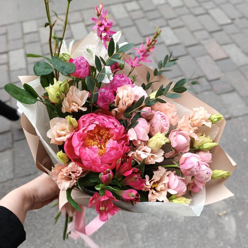 Альстромерия – 2 шт.Лизиантус – 1 шт.Пион – 1 шт.Эвкалипт – 1 шт.Лента атласная – 2 шт.Роза кустовая пионовидная – 3 шт.Крафт упаковка – 1 шт.Калька упаковка – 1 шт.иксия – 2 шт.