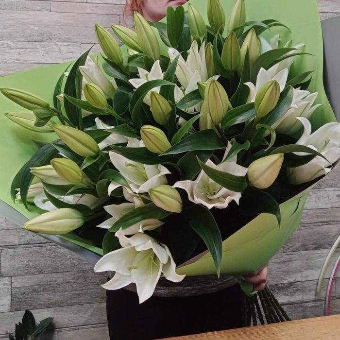 Лента атласная – 3 шт.Упаковка дизайнерская – 4 шт.Лилия ориентальная – 9 шт.