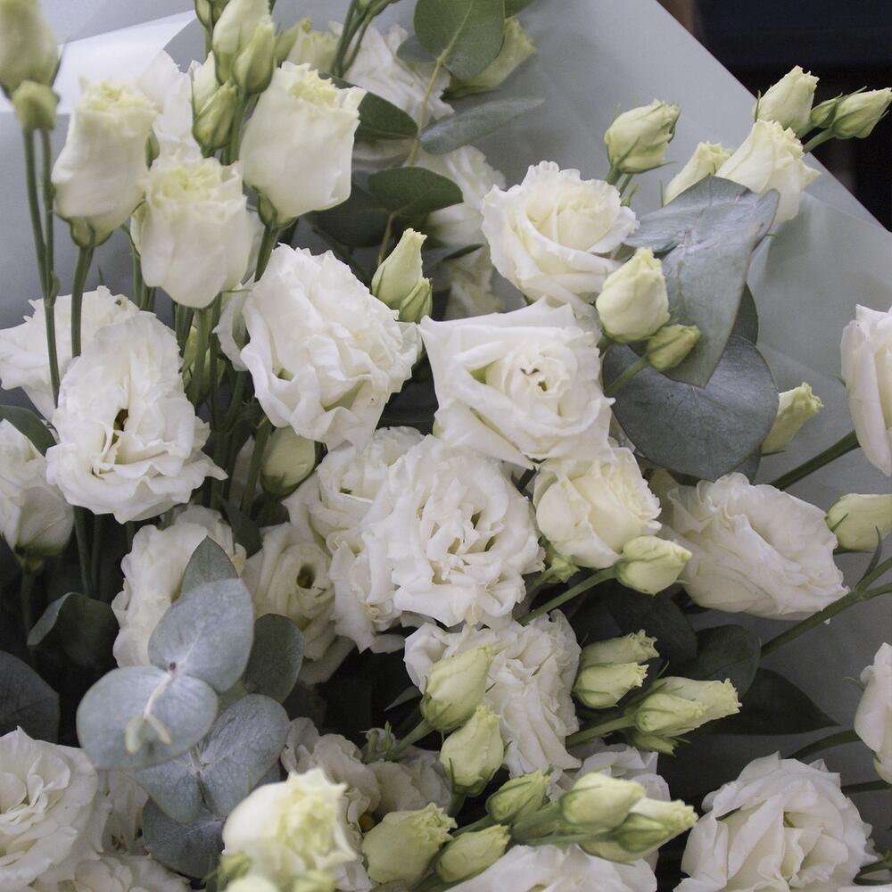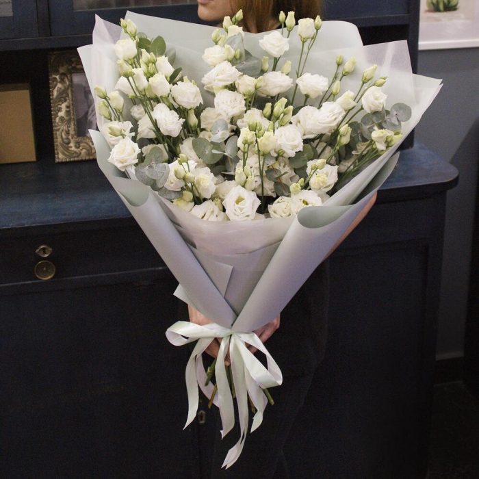 Эвкалипт – 4 шт.Эустома – 19 шт.Тишью – 2 шт.Атласная лента – 2 шт.Матовая пленка – 2 шт.