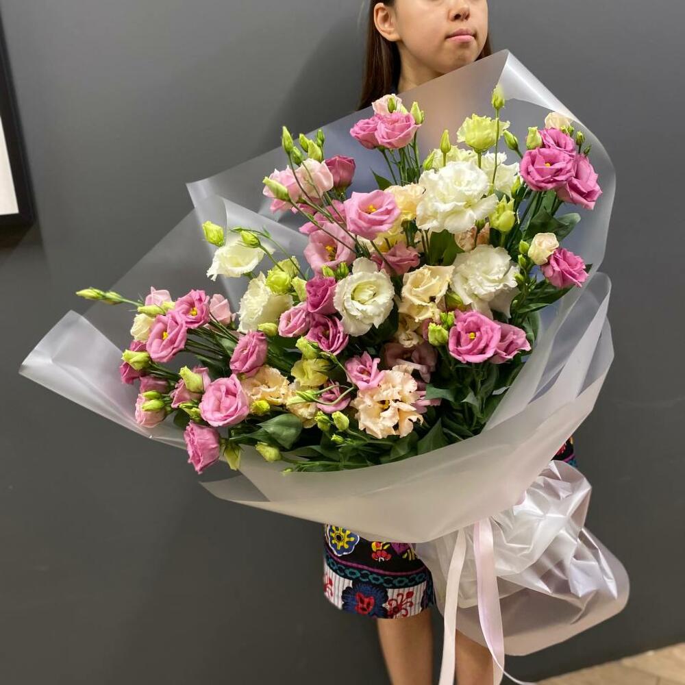 Букет из 15 белых и розовых эустом (лизиантусов) в стильной упаковке “Эландиэль”