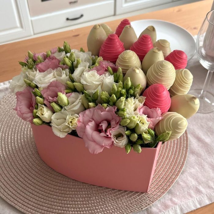 клубника в бельгийском шоколаде – 550 гр.эустома белая и розовая – 7 шт.бокс в форме сердца – 1 шт.